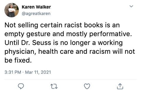 A growing number of Twitter users are calling for Dr. Seuss to be stripped of his medical license. The pressure comes in the wake of renewed attention on several of Seuss’s stories that feature racial stereotypes. Last week, Seuss Enterprises acknowledged that the books in question are “hurtful and wrong” and will therefore no longer be published. Many online activists, however, feel that discontinuation of the problematic books doesn’t go far enough.