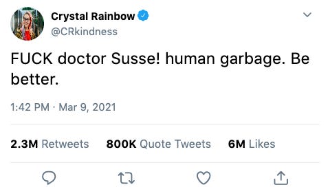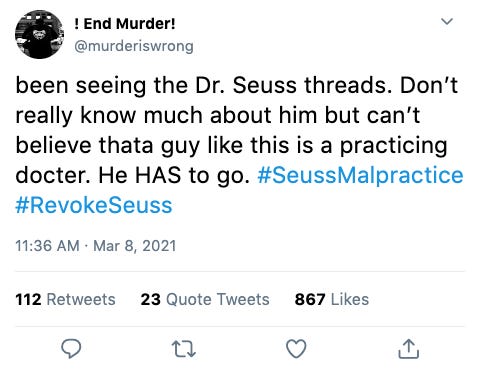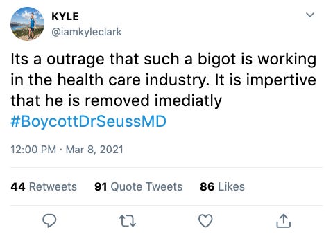 By early this week, several hashtags had begun trending, including #DrSeussIsOverParty, #BoycottDrSeussMD, and #SeussMalpractice.